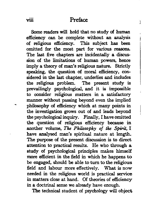 Some readers will hold that no study of human efficiency can be complete without an analysis of religious efficiency. This subject has been omitted for the most part for various reasons The last five chapters are incidentally a discussion of the limitations of human powers, hence imply a theory of man's religious nature. Strictly speaking, the question of moral efficiency, considered in the last chapter, underlies and include: the religious problem. The present study is prevailingly psychological, and it is impossible to consider religious matters in a satisfactory manner without passing beyond even the implies philosophy of efficiency which at many points in the investigation grows out of and leads beyond the psychological inquiry. Finally, I have omitted the question of religious efficiency because in another volume, The Philosophy of the Spirit, I have analysed man's spiritual nature at length The purpose of the present discussion is to direct attention to practical results. He who through study of psychological principles makes himself more efficient in the field in which he happens to be engaged, should be able to turn to the religious field and labour more effectively. What is now needed in the religious world is practical service in matters close at hand. Of theories of efficient in a doctrinal sense we already have enough.