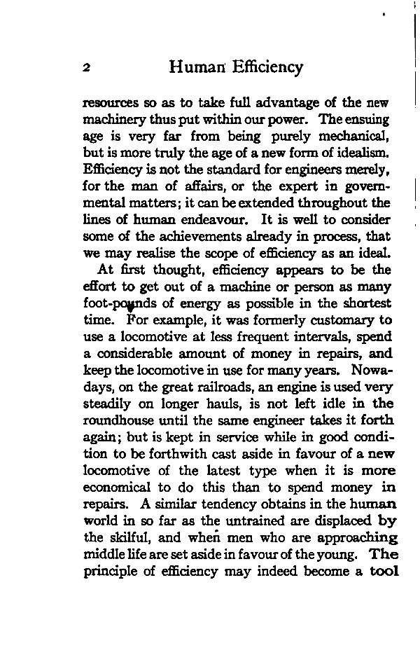 At first thought, efficiency appears to be the effort to get out of a machine or person as many foot-pounds of energy as possible in the shortest time. For example, it was formerly customary to use a locomotive at less frequent intervals, spend a considerable amount of money in repairs, and keep the locomotive in use for many years. Nowadays, on the great railroads, an engine is used very steadily on longer hauls, is not left idle in the roundhouse until the same engineer takes it forth again; but is kept in service while in good condition to be forthwith cast aside in favour of a new locomotive of the latest type when it is more economical to do this than to spend money in repairs. A similar tendency obtains in the human world in so far as the untrained are displaced by the skilful, and when men who are approaching middle life are set aside in favour of the young. The principle of efficiency may indeed become a tool