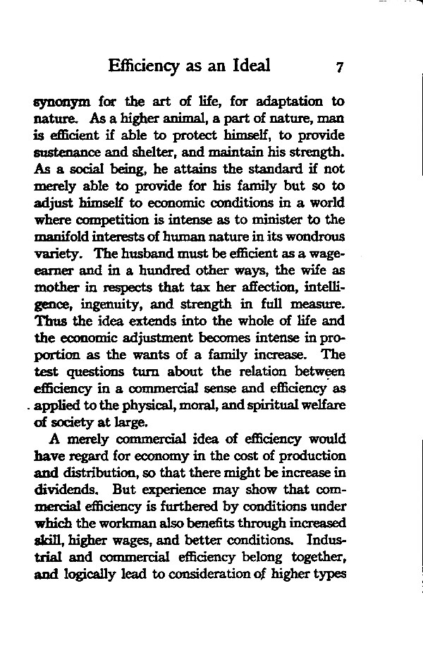 synonym for the art of life, for adaptation to nature. As a higher animal, a part of nature, man is efficient if able to protect himself, to provide sustenance and shelter, and maintain his strength. As a social being, he attains the standard if not merely able to provide for his family but so to adjust himself to economic conditions in a world where competition is intense as to minister to the manifold interests of human nature in its wondrous variety. The husband must be efficient as a wage earner and in a hundred other ways, the wife as mother in respects that tax her affection, intelligence, ingenuity, and strength in full measure. Thus the idea extends into the whole of life and the economic adjustment becomes intense in proportion as the wants of a family increase. The test questions turn about the relation between efficiency in a commercial sense and efficiency as applied to the physical, moral, and spiritual welfare of society at large.