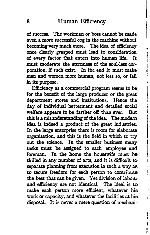 Efficiency as a commercial program seems to be for the benefit of the large producer or the great department stores and institutions. Hence the day of individual betterment and detailed social welfare appears to be farther off than ever. But this is a misunderstanding of the idea. The modern idea is indeed a product of the great industries. In the large enterprise there is room for elaborate organisation, and this is the field in which to try out the science. In the smaller business many tasks must be assigned to each employee and foreman. In the home the housewife must be skilled in any number of arts, and it is difficult to separate planning from execution in such a way as to secure freedom for each person to contribute the best that can be given. Yet division of labour and efficiency are not identical. The ideal is to make each person more efficient, whatever his work or capacity, and whatever the facilities at his disposal. It is never a mere question of mechanical