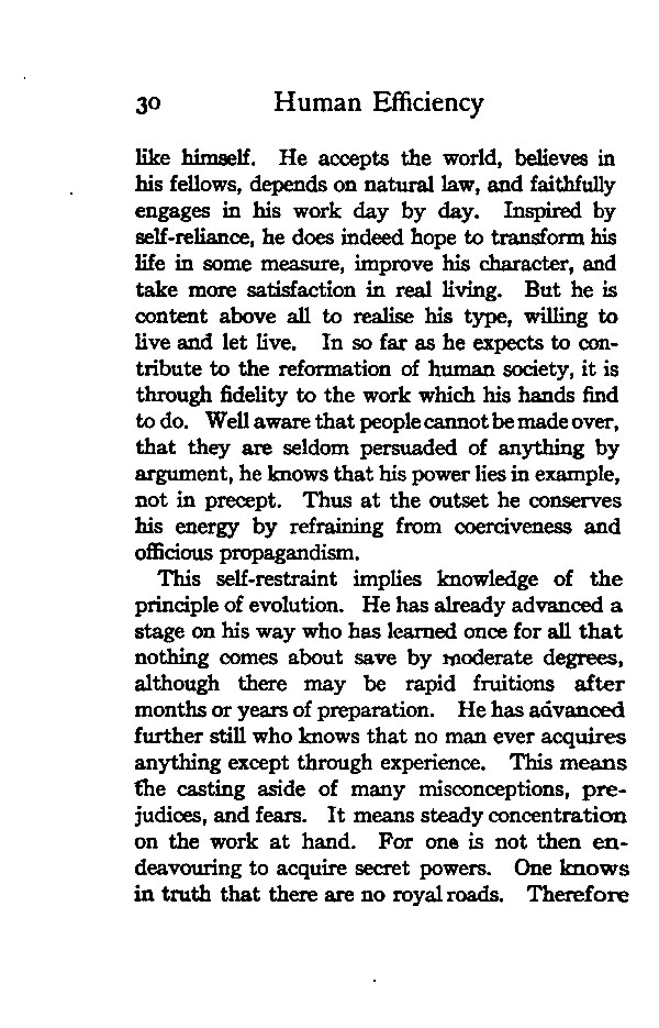 like himself. He accepts the world, believes in his fellows, depends on natural law, and faithfully engages in his work day by day. Inspired by self-reliance, he does indeed hope to transform his life in some measure, improve his character, and take more satisfaction in real living. But he is content above all to realise his type, willing to live and let live. In so far as he expects to contribute to the reformation of human society, it is through fidelity to the work which his hands find to do. Well aware that people cannot be made over, that they are seldom persuaded of anything by argument, he knows that his power lies in example, not in precept. Thus at the outset he conserves his energy by refraining from coerciveness and officious propagandism.
