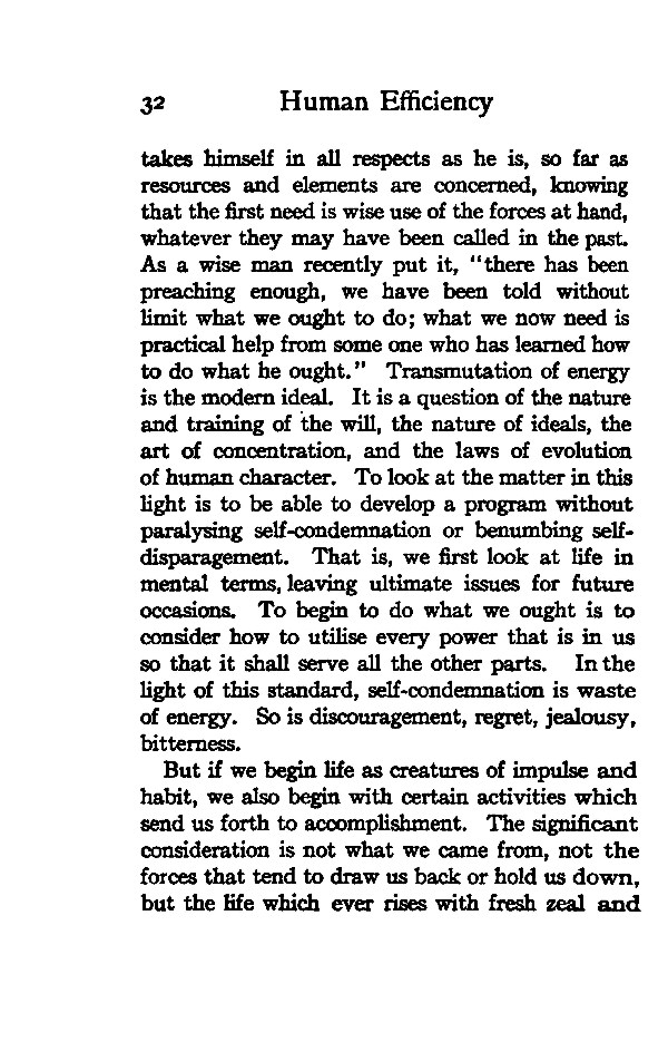 takes himself in all respects as he is, so far as resources and elements are concerned, knowing that the first need is wise use of the forces at hand, whatever they may have been called in the past. As a wise man recently put it, " there has been preaching enough, we have been told without limit what we ought to do; what we now need is practical help from some one who has learned how to do what he ought." Transmutation of energy is the modern ideal. It is a question of the nature and training of the will, the nature of ideals, the art of concentration, and the laws of evolution of human character. To look at the matter in this light is to be able to develop a program without paralysing self-condemnation or benumbing self disparagement. That is, we first look at life in mental terms, leaving ultimate issues for future occasions. To begin to do what we ought is to consider how to utilise every power that is in us so that it shall serve all the other parts. In the light of this standard, self-condemnation is waste of energy. So is discouragement, regret, jealousy, bitterness.