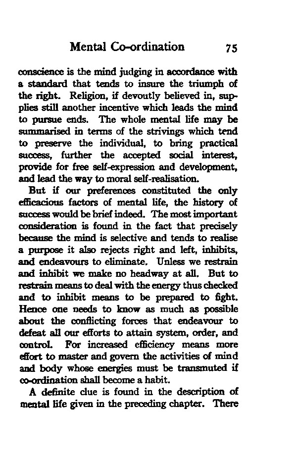 conscience is the mind judging in accordance with a standard that tends to insure the triumph of the right. Religion, if devoutly believed in, supplies still another incentive which leads the mind to pursue ends. The whole mental life may be summarised in terms of the strivings which tend to preserve the individual, to bring practical success, further the accepted social interest, provide for free self-expression and development, and lead the way to moral self-realisation.