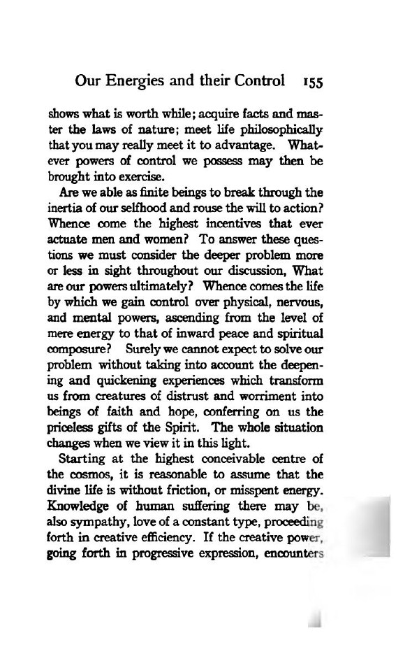 Are we able as finite beings to break through the inertia of our selfhood and rouse the will to action? Whence come the highest incentives that ever actuate men and women? To answer these questions we must consider the deeper problem more or less in sight throughout our discussion, What are our powers ultimately? Whence comes the life by which we gain control over physical, nervous, and mental powers, ascending from the level of mere energy to that of inward peace and spiritual composure? Surely we cannot expect to solve our problem without taking into account the deepening and quickening experiences which transform us from creatures of distrust and worriment into beings of faith and hope, conferring on us the priceless gifts of the Spirit. The whole situation changes when we view it in this light.