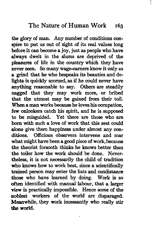 the glory of man. Any number of conditions conspire to put us out of sight of its real values long before it can become a joy, just as people who have always dwelt in the slums are deprived of the pleasures of life in the country which they have never seen. So many wage-earners know it only as a grind that he who bespeaks its beauties and delights is quickly scorned, as if he could never have anything reasonable to say. Others are steadily nagged that they may work more, or bribed that the utmost may be gained from their toil. When a man works because he loves his occupation, few onlookers catch his spirit, and he is supposed to be misguided. Yet there are those who are born with such a love of work that this zest could alone give them happiness under almost any conditions. Officious observers intervene and mar what might have been a good piece of work, because the theorist forsooth thinks he knows better than the toiler how the work should be done. Nevertheless, it is not necessarily the child of tradition who knows how to work best, since a scientifically trained person may enter the lists and outdistance those who have learned by doing. Work is so often identified with manual labour, that a larger view is practically impossible. Hence some of the noblest workers of the world are disparaged. Meanwhile, they work incessantly who really stir the world.