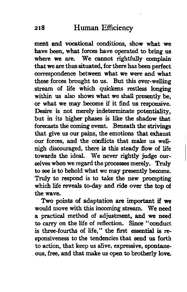 Two points of adaptation are important if we would move with this incoming stream. We need a practical method of adjustment, and we need to carry on the life of reflection. Since "conduct is three-fourths of life," the first essential is responsiveness to the tendencies that send us forth to action, that keep us alive, expressive, spontaneous, free, and that make us open to brotherly love.