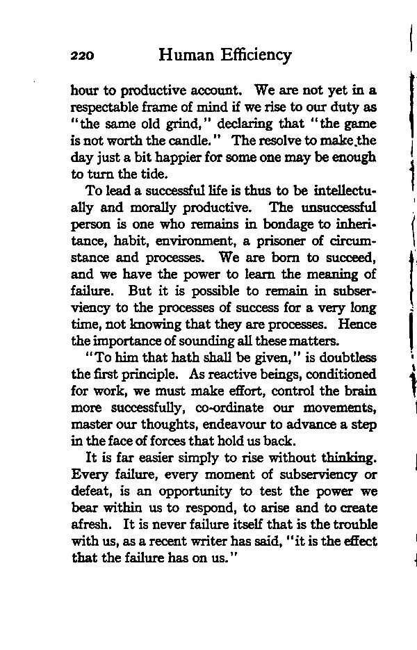 To lead a successful life is thus to be intellectually and morally productive. The unsuccessful person is one who remains in bondage to inheritance, habit, environment, a prisoner of circumstance and processes. We are born to succeed, and we have the power to learn the meaning of failure. But it is possible to remain in subserviency to the processes of success for a very long time, not knowing that they are processes. Hence the importance of sounding all these matters.