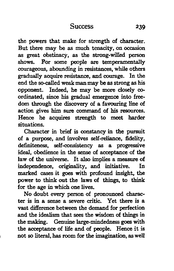 the powers that make for strength of character. But there may be as much tenacity, on occasion as great obstinacy, as the strong-willed person shows. For some people are temperamentally courageous, abounding in resistances, while others gradually acquire resistance, and courage. In the end the so-called weak man may be as strong as his opponent. Indeed, he may be more closely coordinated, since his gradual emergence into freedom through the discovery of a favouring line of action gives him sure command of his resources. Hence he acquires strength to meet harder situations.
