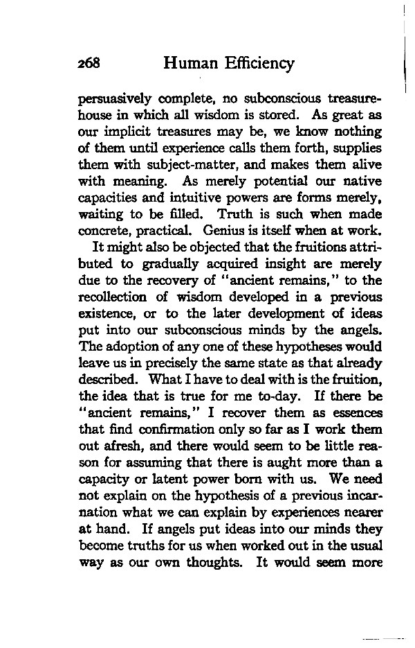 persuasively complete, no subconscious treasure house in which all wisdom is stored. As great as our implicit treasures may be, we know nothing of them until experience calls them forth, supplies them with subject-matter, and makes them alive with meaning. As merely potential our native capacities and intuitive powers are forms merely, waiting to be filled. Truth is such when made concrete, practical. Genius is itself when at work. It might also be objected that the fruitions attributed to gradually acquired insight are merely due to the recovery of "ancient remains," to the recollection of wisdom developed in a previous existence, or to the later development of ideas put into our subconscious minds by the angels. The adoption of any one of these hypotheses would leave us in precisely the same state as that already described. What I have to deal with is the fruition, the idea that is true for me to-day. If there be "ancient remains," I recover them as essences that find confirmation only so far as I work them out afresh, and there would seem to be little reason for assuming that there is aught more than a capacity or latent power born with us. We need not explain on the hypothesis of a previous incarnation what we can explain by experiences nearer at hand. If angels put ideas into our minds they become truths for us when worked out in the usual way as our own thoughts. It would seem more