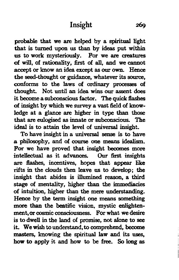 To have insight in a universal sense is to have a philosophy, and of course one means idealism. For we have proved that insight becomes more intellectual as it advances. Our first insights are flashes, incentives, hopes that appear like rifts in the clouds then leave us to develop; the insight that abides is illumined reason, a third stage of mentality, higher than the immediacies of intuition, higher than the mere understanding. Hence by the term insight one means something more than the beatific vision, mystic enlightenment, or cosmic consciousness. For what we desire is to dwell in the land of promise, not alone to see it. We wish to understand, to comprehend, become masters, knowing the spiritual law and its uses, how to apply it and how to be free. So long as