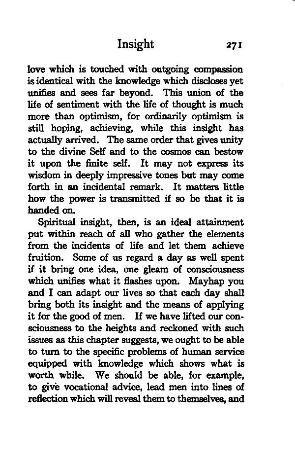 love which is touched with outgoing compassion is identical with the knowledge which discloses yet unifies and sees far beyond. This union of the life of sentiment with the life of thought is much more than optimism, for ordinarily optimism is still hoping, achieving, while this insight has actually arrived. The same order that gives unity to the divine Self and to the cosmos can bestow it upon the finite self. It may not express its wisdom in deeply impressive tones but may come forth in an incidental remark. It matters little how the power is transmitted if so be that it is handed on.