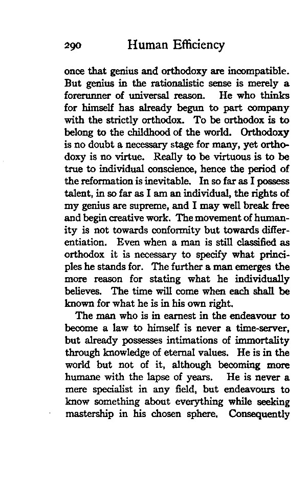 once that genius and orthodoxy are incompatible. But genius in the rationalistic sense is merely a forerunner of universal reason. He who thinks for himself has already begun to part company with the strictly orthodox. To be orthodox is to belong to the childhood of the world. Orthodoxy is no doubt a necessary stage for many, yet orthodoxy is no virtue. Really to be virtuous is to be true to individual conscience, hence the period of the reformation is inevitable. In so far as I possess talent, in so far as I am an individual, the rights of my genius are supreme, and I may well break free and begin creative work. The movement of humanity is not towards conformity but towards differentiation. Even when a man is still classified as orthodox it is necessary to specify what principles he stands for. The further a man emerges the more reason for stating what he individually believes. The time will come when each shall be known for what he is in his own right.