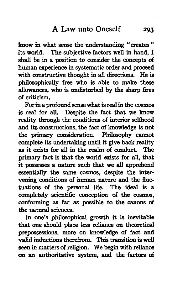 For in a profound sense what is real in the cosmos is real for all. Despite the fact that we know reality through the conditions of interior selfhood and its constructions, the fact of knowledge is not the primary consideration. Philosophy cannot complete its undertaking until it give back reality as it exists for all in the realm of conduct. The primary fact is that the world exists for all, that it possesses a nature such that we all apprehend essentially the same cosmos, despite the intervening conditions of human nature and the fluctuations of the personal life. The ideal is a completely scientific conception of the cosmos, conforming as far as possible to the canons of the natural sciences.