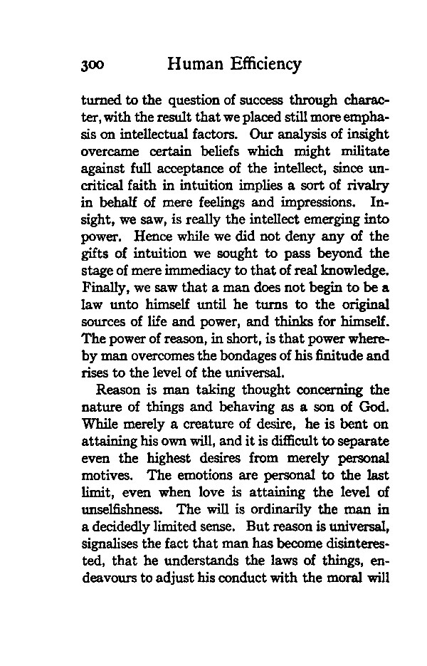 turned to the question of success through character, with the result that we placed still more emphasis on intellectual factors. Our analysis of insight overcame certain beliefs which might militate against full acceptance of the intellect, since uncritical faith in intuition implies a sort of rivalry in behalf of mere feelings and impressions. Insight, we saw, is really the intellect emerging into power. Hence while we did not deny any of the gifts of intuition we sought to pass beyond the stage of mere immediacy to that of real knowledge. Finally, we saw that a man does not begin to be a law unto himself until he turns to the original sources of life and power, and thinks for himself. The power of reason, in short, is that power whereby man overcomes the bondages of his finitude and rises to the level of the universal.