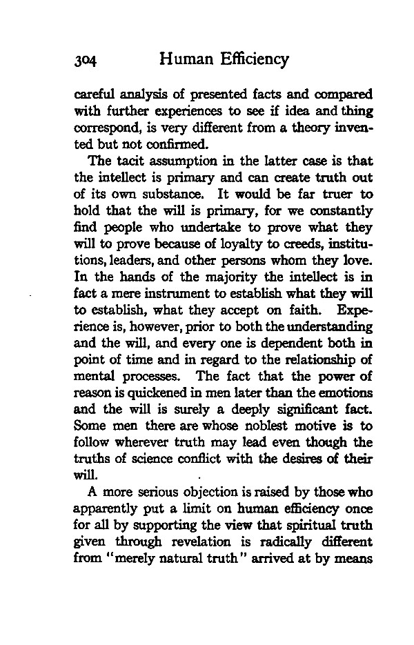 The tacit assumption in the latter case is that the intellect is primary and can create truth out of its own substance. It would be far truer to hold that the will is primary, for we constantly find people who undertake to prove what they will to prove because of loyalty to creeds, institutions, leaders, and other persons whom they love. In the hands of the majority the intellect is in fact a mere instrument to establish what they will to establish, what they accept on faith. Experience is, however, prior to both the understanding and the will, and every one is dependent both in point of time and in regard to the relationship of mental processes. The fact that the power of reason is quickened in men later than the emotions and the will is surely a deeply significant fact. Some men there are whose noblest motive is to follow wherever truth may lead even though the truths of science conflict with the desires of their will.