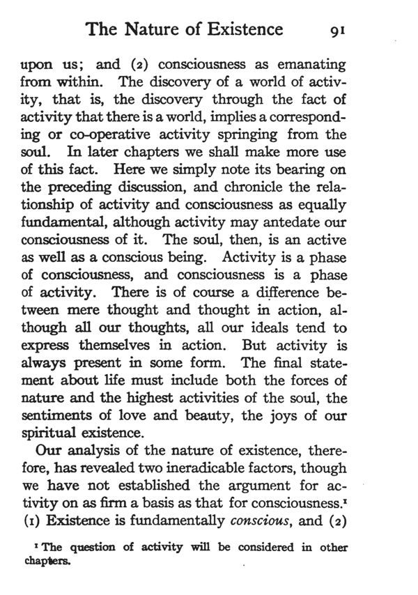 Our analysis of the nature of existence, therefore, has revealed two ineradicable factors, though we have not established the argument for activity on as firm a basis as that for consciousness.* (1) Existence is fundamentally conscious, and (2)