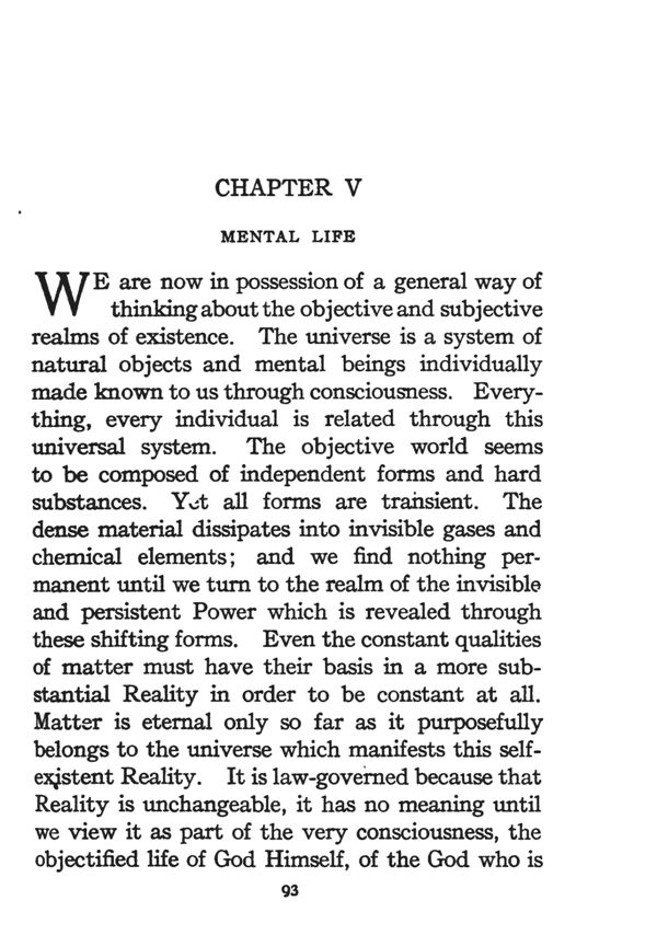 WE are now in possession of a general way of thinking about the objective and subjective realms of existence. The universe is a system of natural objects and mental beings individually made known to us through consciousness. Every thing, every individual is related through this universal system. The objective world seems to be composed of independent forms and hard substances. Yet all forms are transient. The dense material dissipates into invisible gases and chemical elements; and we find nothing permanent until we turn to the realm of the invisible and persistent Power which is revealed through these shifting forms. Even the constant qualities of matter must have their basis in a more substantial Reality in order to be constant at all. Matter is eternal only so far as it purposefully belongs to the universe which manifests this self-existent Reality. It is law-governed because that Reality is unchangeable, it has no meaning until we view it as part of the very consciousness, the objectified life of God Himself, of the God who is