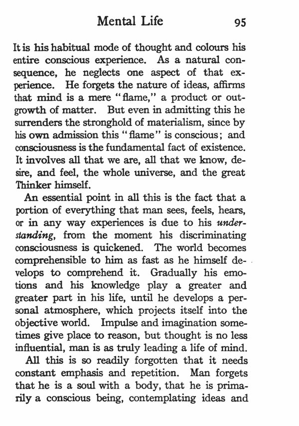 An essential point in all this is the fact that a portion of everything that man sees, feels, hears, or in any way experiences is due to his understanding, from the moment his discriminating consciousness is quickened. The world becomes comprehensible to him as fast as he himself develops to comprehend it. Gradually his emotions and his knowledge play a greater and greater part in his life, until he develops a personal atmosphere, which projects itself into the objective world. Impulse and imagination sometimes give place to reason, but thought is no less influential, man is as truly leading a life of mind.