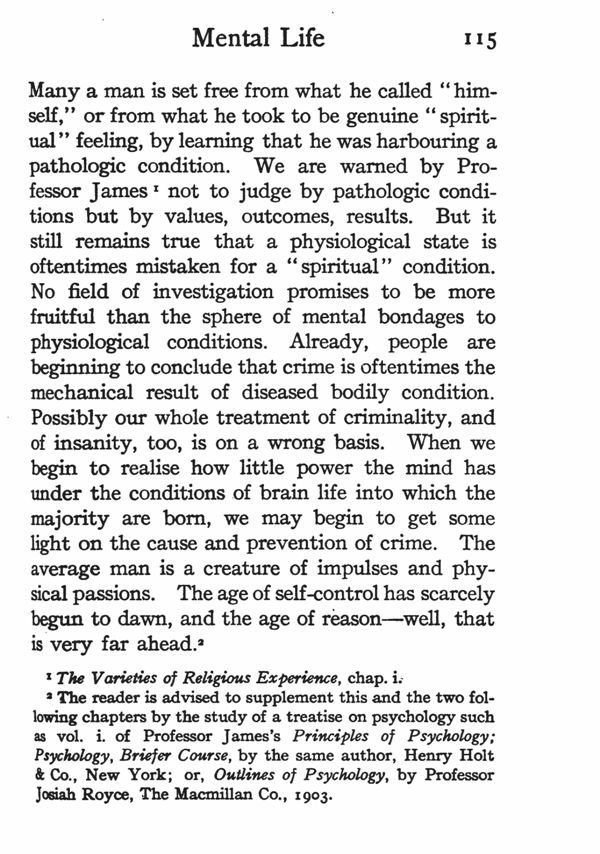 Many a man is set free from what he called "himself," or from what he took to be genuine "spiritual" feeling, by learning that he was harbouring a pathologic condition. We are warned by Professor James 1 not to judge by pathologic conditions but by values, outcomes, results. But it still remains true that a physiological state is oftentimes mistaken for a "spiritual" condition. No field of investigation promises to be more fruitful than the sphere of mental bondages to physiological conditions. Already, people are beginning to conclude that crime is oftentimes the mechanical result of diseased bodily condition. Possibly our whole treatment of criminality, and of insanity, too, is on a wrong basis. When we begin to realise how little power the mind has under the conditions .of brain life into which the majority are born, we may begin to get some light on the cause and prevention of crime. The average man is a creature of impulses and physical passions. The age of self-control has scarcely begun to dawn, and the age of reason well, that is very far ahead.2