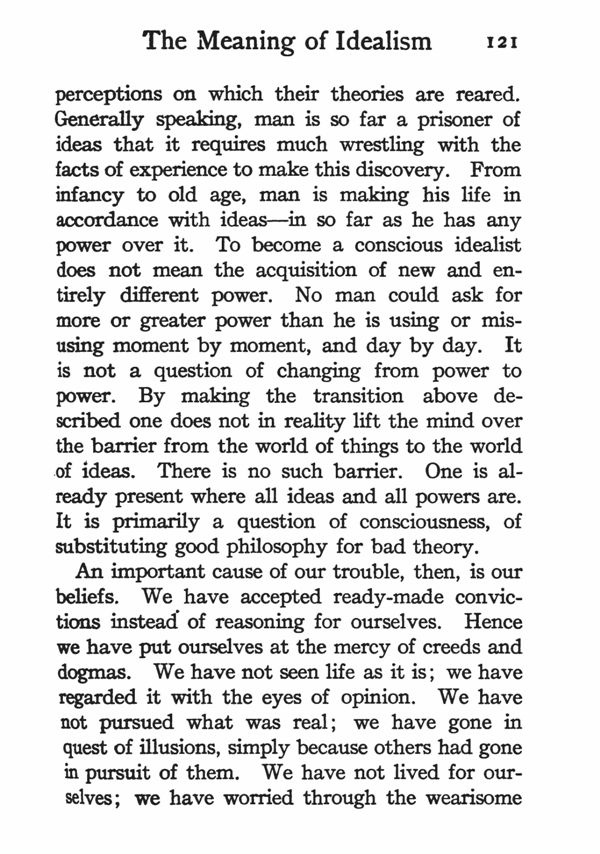perceptions on which their theories are reared. Generally speaking, man is so far a prisoner of ideas that it requires much wrestling with the facts of experience to make this discovery. From infancy to old age, man is making his life in accordance with ideas---in so far as he has any power over it. To become a conscious idealist does not mean the acquisition of new and entirely different power. No man could ask for more or greater power than he is using or misusing moment by moment, and day by day. It is not a question of changing from power to power. By making the transition above described one does not in reality lift the mind over the barrier from the world of things to the world of ideas. There is no such barrier. One is already present where all ideas and all powers are. It is primarily a question of consciousness, of substituting good philosophy for bad theory.