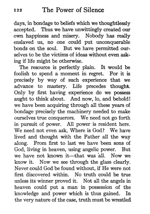 The resource is perfectly plain. It would be foolish to spend a moment in regret. For it is precisely by way of such experience that we advance to mastery. Life precedes thought. Only by first having experience do we possess aught to think about. And now, lo, and behold! we have been acquiring through all these years of bondage precisely the machinery needed to make ourselves true conquerors. We need not go forth in pursuit of power. All power is resident here. We need not even ask, Where is God? We have lived and thought with the Father all the way along. From first to last we have been sons of God, living in heaven, using angelic power. But we have not known it--that was all. Now we know it. Now we see through the glass clearly. Never could God be found without, if He were not first discovered within. No truth could be true unless its winner proved it. Not all the angels in heaven could put a man in possession of the knowledge and power which is thus gained. In the very nature of the case, truth must be wrestled