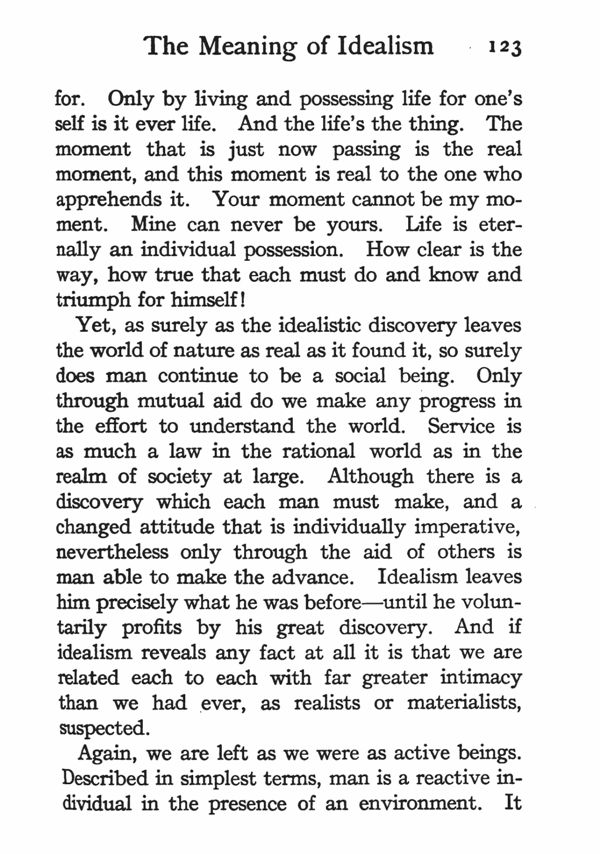 Yet, as surely as the idealistic discovery leaves the world of nature as real as it found it, so surely does man continue to be a social being. Only through mutual aid do we make any progress in the effort to understand the world. Service is as much a law in the rational world as in the realm of society at large. Although there is a discovery which each man must make, and a changed attitude that is individually imperative, nevertheless only through the aid of others is man able to make the advance. Idealism leaves him precisely what he was before--until he voluntarily profits by his great discovery. And if idealism reveals any fact at all it is that we are related each to each with far greater intimacy than we had ever, as realists or materialists, suspected.