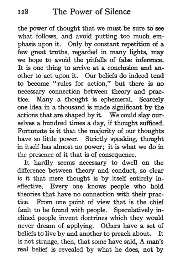 It hardly seems necessary to dwell on the difference between theory and conduct, so clear is it that mere thought is by itself entirely ineffective. Everyone knows people who hold theories that have no connection with their practice. From one point of view that is the chief fault to be found with people. Speculatively inclined people invent doctrines which they would never dream of applying. Others have a set of beliefs to live by and another to preach about. It is not strange, then, that some have said, A man's real belief is revealed by what he does, not by