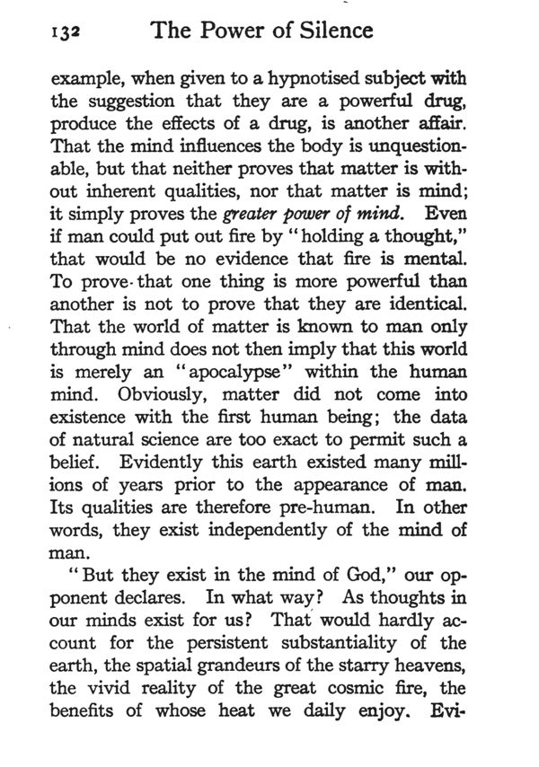 example, when given to a hypnotised subject with the suggestion that they are a powerful drug, produce the effects of a drug, is another affair. That the mind influences the body is unquestionable, but that neither proves that matter is without inherent qualities, nor that matter is mind; it simply proves the greater power of mind. Even if man could put out fire by "holding a thought," that would be no evidence that fire is mental. To prove that one thing is more powerful than another is not to prove that they are identical. That the world of matter is known to man only through mind does not then imply that this world is merely an "apocalypse" within the human mind. Obviously, matter did not come into existence with the first human being; the data of natural science are too exact to permit such a belief. Evidently this earth existed many millions of years prior to the appearance of man. Its qualities are therefore pre-human. In other words, they exist independently of the mind of man.