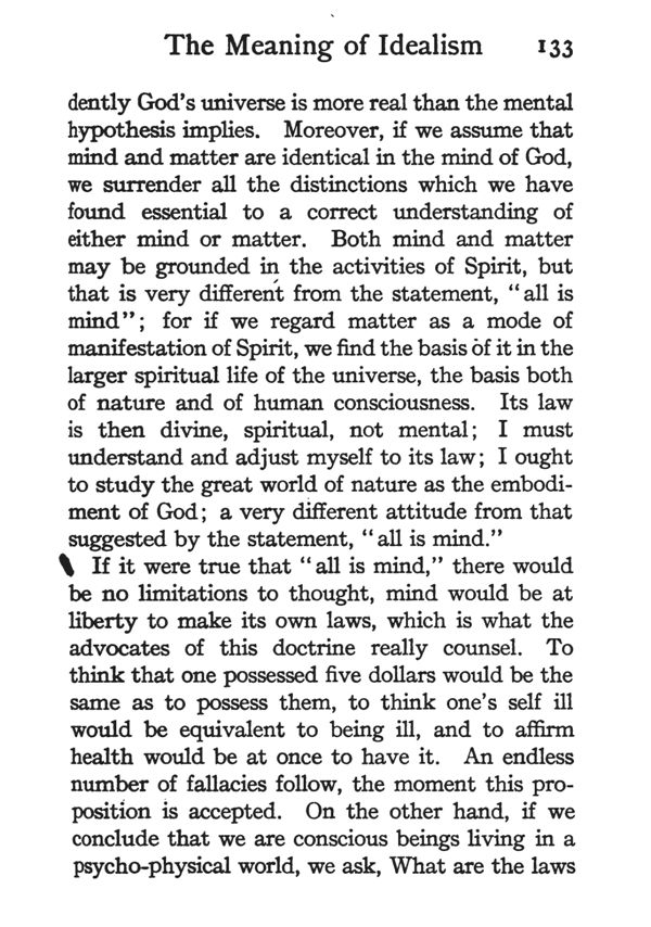 God's universe is more real than the mental hypothesis implies. Moreover, if we assume that mind and matter are identical in the mind of God, we surrender all the distinctions which we have found essential to a correct understanding of either mind or matter. Both mind and matter may be grounded in the activities of Spirit, but that is very different from the statement, "all is mind"; for if we regard matter as a mode of manifestation of Spirit, we find the basis of it in the larger spiritual life of the universe, the basis both of nature and of human consciousness. Its law is then divine, spiritual, not mental; I must understand and adjust myself to its law; I ought to study the great world of nature as the embodiment of God; a very different attitude from that suggested by the statement, "all is mind."