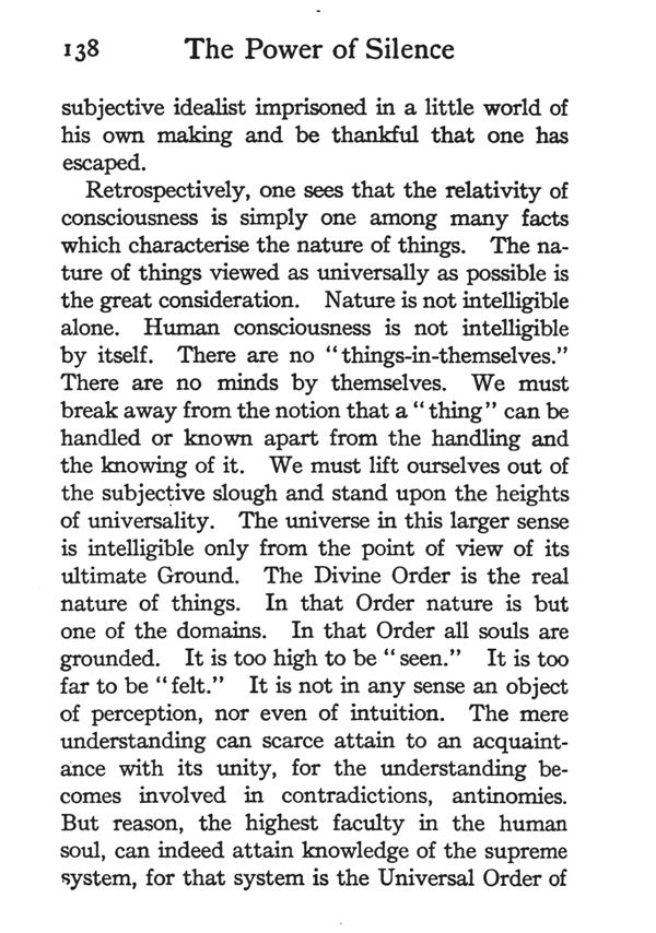 Retrospectively, one sees that the relativity of consciousness is simply one among many facts which characterise the nature of things. The nature of things viewed as universally as possible is the great consideration. Nature is not intelligible alone. Human consciousness is not intelligible by itself. There are no ''things-in-themselves.'' There are no minds by themselves. We must break away from the notion that a ''thing'' can be handled or known apart from the handling and the knowing of it. We must lift ourselves out of the subjective slough and stand upon the heights of universality, The universe in this larger sense is intelligible only from the point of view of its ultimate Ground. The Divine Order is the real nature of things. In that Order nature is but one of the domains. In that Order all souls are grounded. It is too high to be "seen." It is too far to be "felt." It is not in any sense an object of perception, nor even of intuition. The mere understanding can scarce attain to an acquaintance with its unity, for the understanding becomes involved in contradictions, antinomies. But reason, the highest faculty in the human soul, can indeed attain knowledge of the supreme system, for that system is the Universal Order of