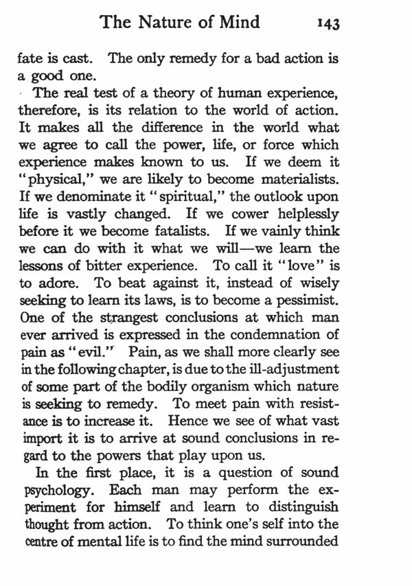 The real test of a theory of human experience, therefore, is its relation to the world of action. It makes all the difference in the world what we agree to call the power, life, or force which experience makes known to us. If we deem it "physical," we are likely to become materialists. If we denominate it "spiritual," the outlook upon life is vastly changed. If we cower helplessly before it we become fatalists. If we vainly think we can do with it what we will--we learn the lessons of bitter experience. To call it "love" is to adore. To beat against it, instead of wisely seeking to learn its laws, is to become a pessimist. One of the strangest conclusions at which man ever arrived is expressed in the condemnation of pain as "evil." Pain, as we shall more clearly see in the following chapter, is due to the ill-adjustment of some part of the bodily organism which nature is seeking to remedy. To meet pain with resistance is to increase it. Hence we see of what vast import it is to arrive at sound conclusions in regard to the powers that play upon us.