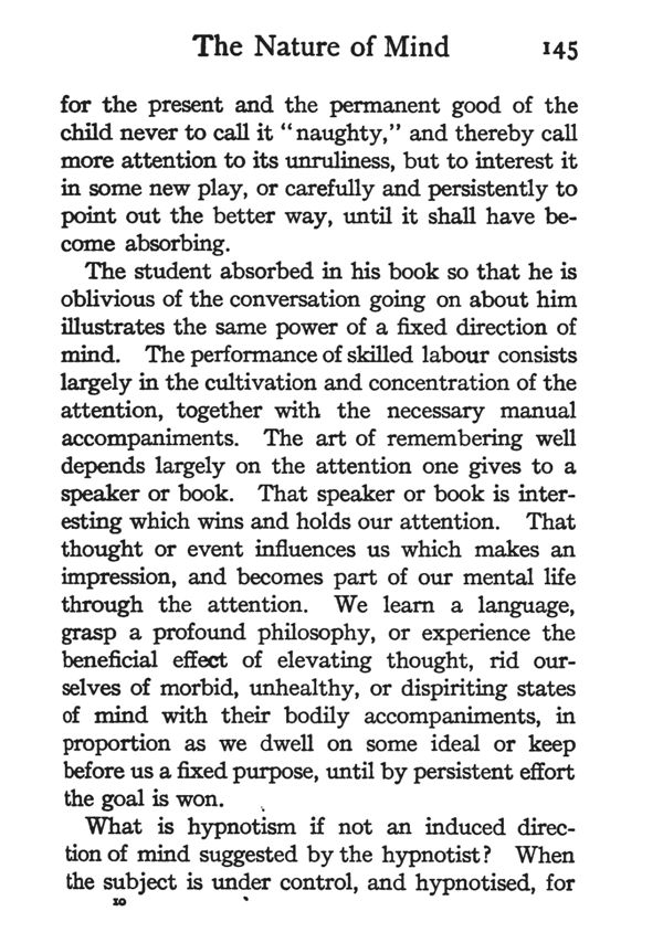 The student absorbed in his book so that he is oblivious of the conversation going on about him illustrates the same power of a fixed direction of mind. The performance of skilled labour consists largely in the cultivation and concentration of the attention, together with the necessary manual accompaniments. The art of remembering well depends largely on the attention one gives to a speaker or book. That speaker or book is interesting which wins and holds our attention. That thought or event influences us which makes an impression, and becomes part of our mental life through the attention. We learn a language, grasp a profound philosophy, or experience the beneficial effect of elevating thought, rid ourselves of morbid, unhealthy, or dispiriting states of mind with their bodily accompaniments, in proportion as we dwell on some ideal or keep before us a fixed purpose, until by persistent effort the goal is won.