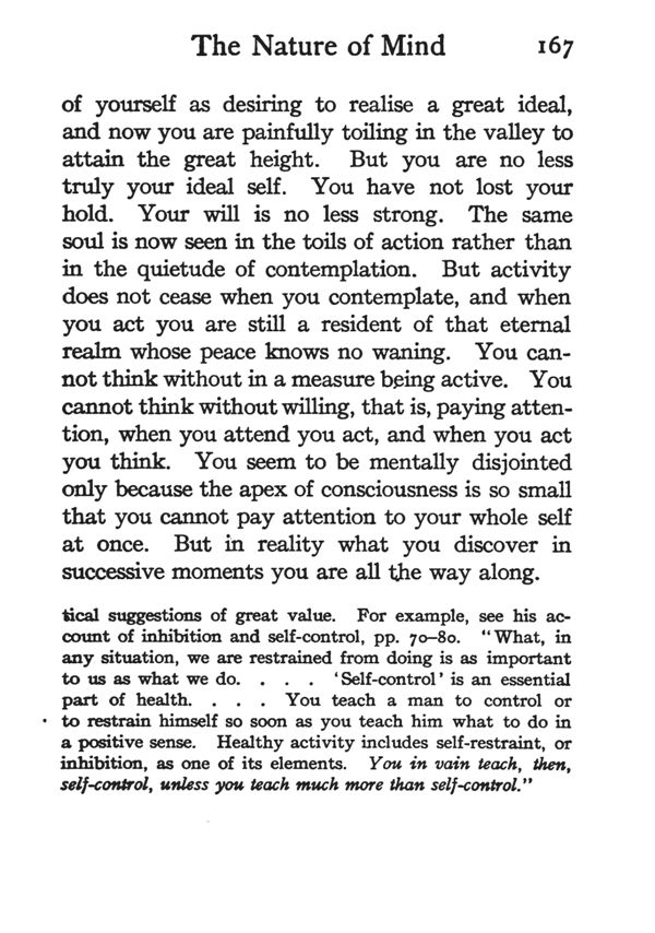 *The term "will," for example, refers to the whole meaning of our conscious life. See Royce, "Outlines of Psychology," p, 334 et seq. Professor Royce's treatise contains many practical suggestions of great value. For example, see his account of inhibition and self-control, pp.70-80. "What, in any situation, we are restrained from doing is as important to us as what we do. . . . 'Self-control' is an essential part of health. . . . You teach a man to control or to restrain himself so soon as you teach him what to do in a positive sense. Healthy activity includes self-restraint, or inhibition, as one of its elements. You in vain teach, then, self-control, unless you teach much more than self-control."