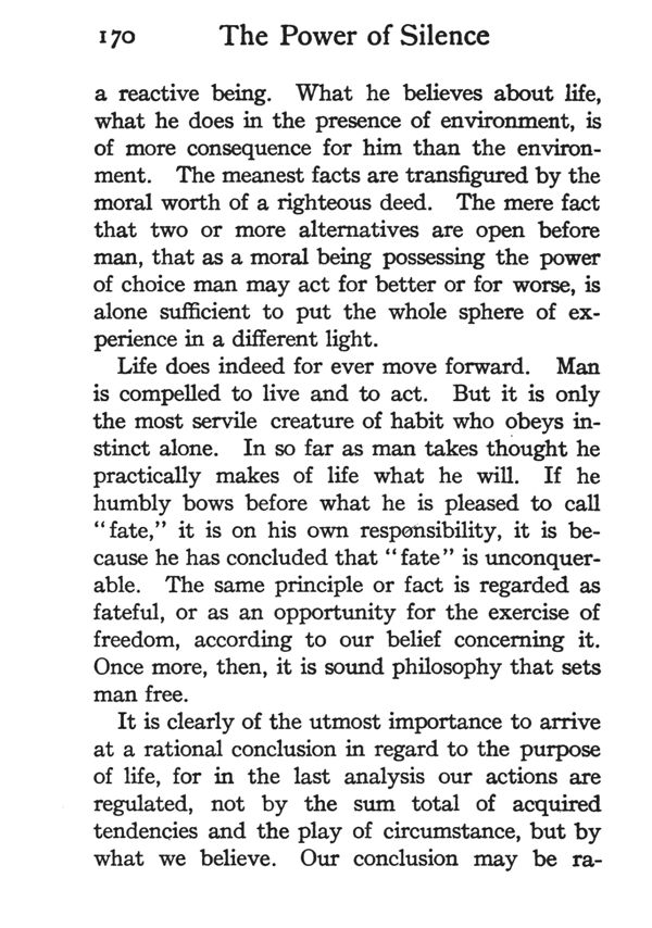 a reactive being. What he believes about life, what he does in the presence of environment, is of more consequence for him than the environment. The meanest facts are transfigured by the moral worth of a righteous deed. The mere fact that two or more alternatives are open before man, that as a moral being possessing the power of choice man may act for better or for worse, is alone sufficient to put the whole sphere of experience in a different light.