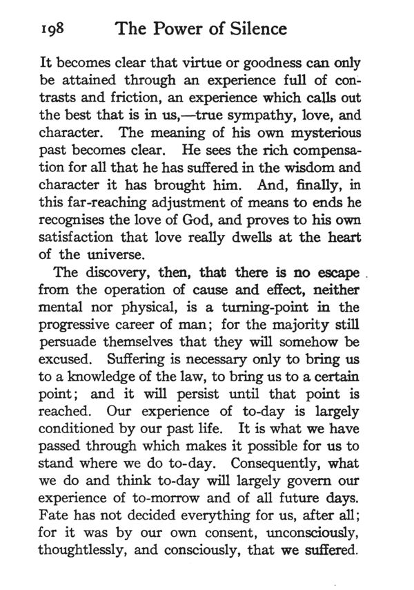 The discovery, then, that there is no escape from the operation of cause and effect, neither mental nor physical, is a turning-point in the progressive career of man; for the majority still persuade themselves that they will somehow be excused. Suffering is necessary only to bring us to a knowledge of the law, to bring us to a certain point; and it will persist until that point is reached. Our experience of today is largely conditioned by our past life. It is what we have passed through which makes it possible for us to stand where we do today. Consequently, what we do and think today will largely govern our experience of tomorrow and of all future days. Fate has not decided everything for us, after all; for it was by our own consent, unconsciously, thoughtlessly, and consciously, that we suffered.