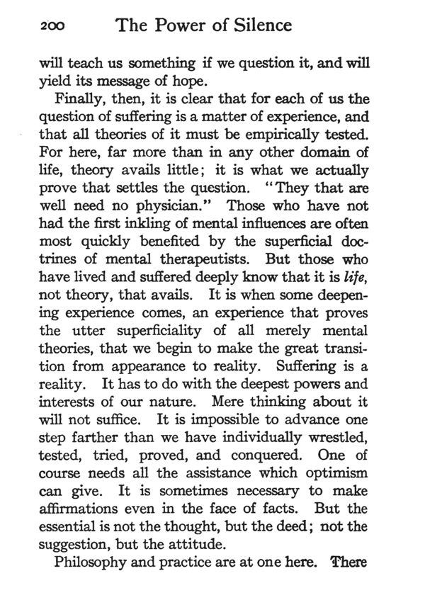 Finally, then, it is clear that for each of us the question of suffering is a matter of experience, and that all theories of it must be empirically tested. For here, far more than in any other domain of life, theory avails little; it is what we actually prove that settles the question. "They that are well need no physician." Those who have not had the first inkling of mental influences are often most quickly benefited by the superficial doctrines of mental therapeutists. But those who have lived and suffered deeply know that it is life, not theory, that avails. It is when some deepening experience comes, an experience that proves the utter superficiality of all merely mental theories, that we begin to make the great transition from appearance to reality. Suffering is a reality. It has to do with the deepest powers and interests of our nature. Mere thinking about it will not suffice. It is impossible to advance one step farther than we have individually wrestled, tested, tried, proved, and conquered. One of course needs all the assistance which optimism can give. It is sometimes necessary to make affirmations even in the face of facts. But the essential is not the thought, but the deed; not the suggestion, but the attitude.
