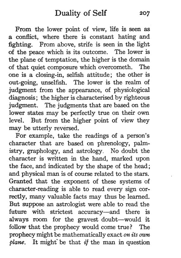 From the lower point of view, life is seen as a conflict, where there is constant hating and fighting. From above, strife is seen in the light of the peace which is its outcome. The lower is the plane of temptation, the higher is the domain of that quiet composure which overcometh. The one is a closing-in, selfish attitude; the other is out-going, unselfish. The lower is the realm of judgment from the appearance, of physiological diagnosis; the higher is characterised by righteous judgment. The judgments that are based on the lower states may be perfectly true on their own level. But from the higher point of view they may be utterly reversed.