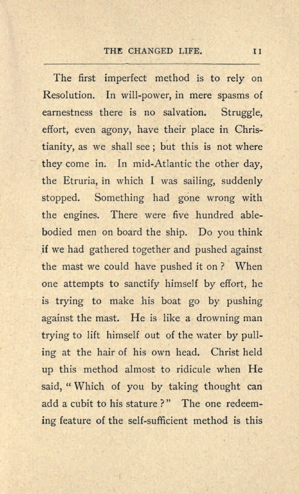 The first imperfect method is to rely on Resolution. In will-power, in mere spasms of earnestness there is no salvation. Struggle, effort, even agony, have their place in Christianity, as we shall see; but this is not where they come in. In mid-Atlantic the other day, the Etruria, in which I was sailing, suddenly stopped. Something had gone wrong with the engines. There were five hundred able bodied men on board the ship. Do you think if we had gathered together and pushed against the mast we could have pushed it on? When one attempts to sanctify himself by effort, he is trying to make his boat go by pushing against the mast. He is like a drowning man trying to lift himself out of the water by pulling at the hair of his own head. Christ held up this method almost to ridicule when He said, "Which of you by taking thought can add a cubit to his stature?" The one redeeming feature of the self-sufificient method is this
