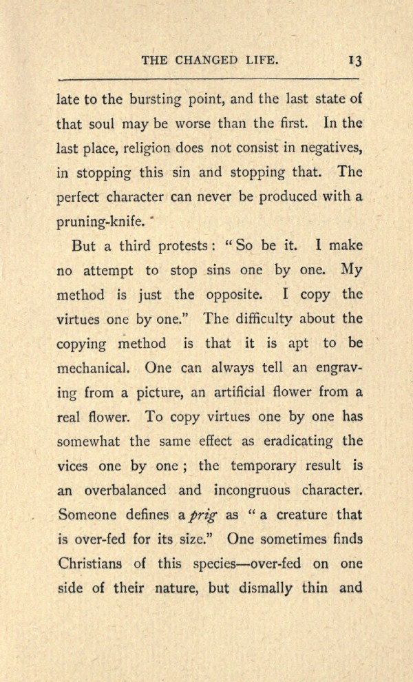 But a third protests: "So be it. I make no attempt to stop sins one by one. My method is just the opposite. I copy the virtues one by one." The difficulty about the copying method is that it is apt to be mechanical. One can always tell an engraving from a picture, an artificial flower from a real flower. To copy virtues one by one has somewhat the same effect as eradicating the vices one by one; the temporary result is an overbalanced and incongruous character. Someone defines a prig as "a creature that is over-fed for its size." One sometimes finds Christians of this species --- over-fed on one side of their nature, but dismally thin and