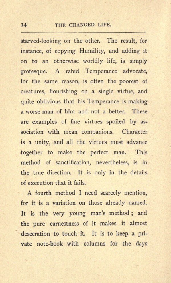 starved-looking on the other. The result, for instance, of copying Humility, and adding it on to an otherwise worldly life, is simply grotesque. A rabid Temperance advocate, for the same reason, is often the poorest of creatures, flourishing on a single virtue, and quite oblivious that his Temperance is making a worse man of him and not a better. These are examples of fine virtues spoiled by association with mean companions. Character is a unity, and all the virtues must advance together to make the perfect man. This method of sanctification, nevertheless, is in the true direction. It is only in the details of execution that it fails.