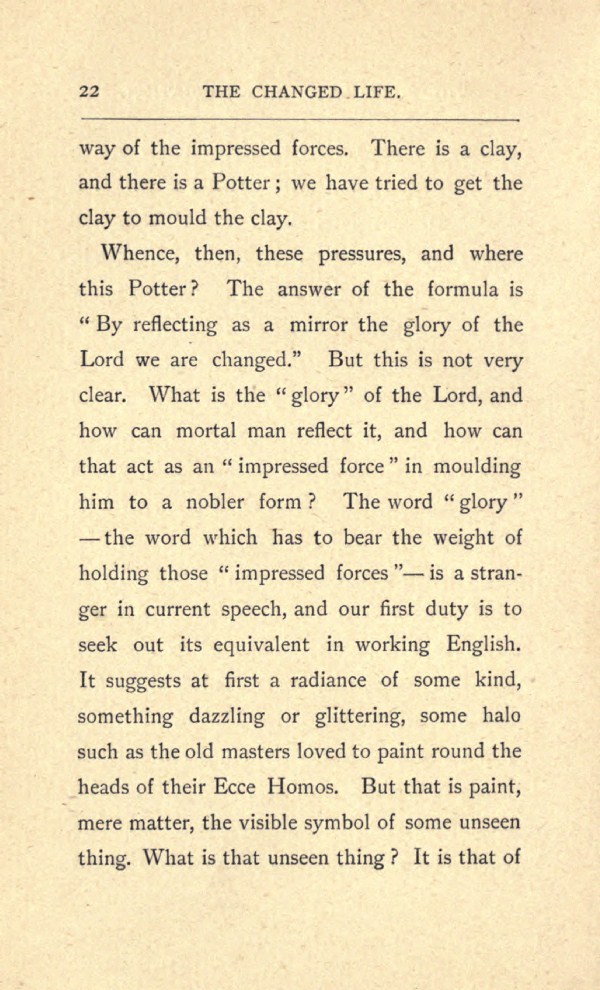 Whence, then, these pressures, and where this Potter? The answer of the formula is "By reflecting as a mirror the glory of the Lord we are changed." But this is not very clear. What is the " glory "of the Lord, and how can mortal man reflect it, and how can that act as an " impressed force" in moulding him to a nobler form ? The word "glory" --- the word which has to bear the weight of holding those "impressed forces" --- is a stranger in current speech, and our first duty is to seek out its equivalent in working English. It suggests at first a radiance of some kind, something dazzling or glittering, some halo such as the old masters loved to paint round the heads of their Ecce Homos. But that is paint, mere matter, the visible symbol of some unseen thing. What is that unseen thing? It is that of