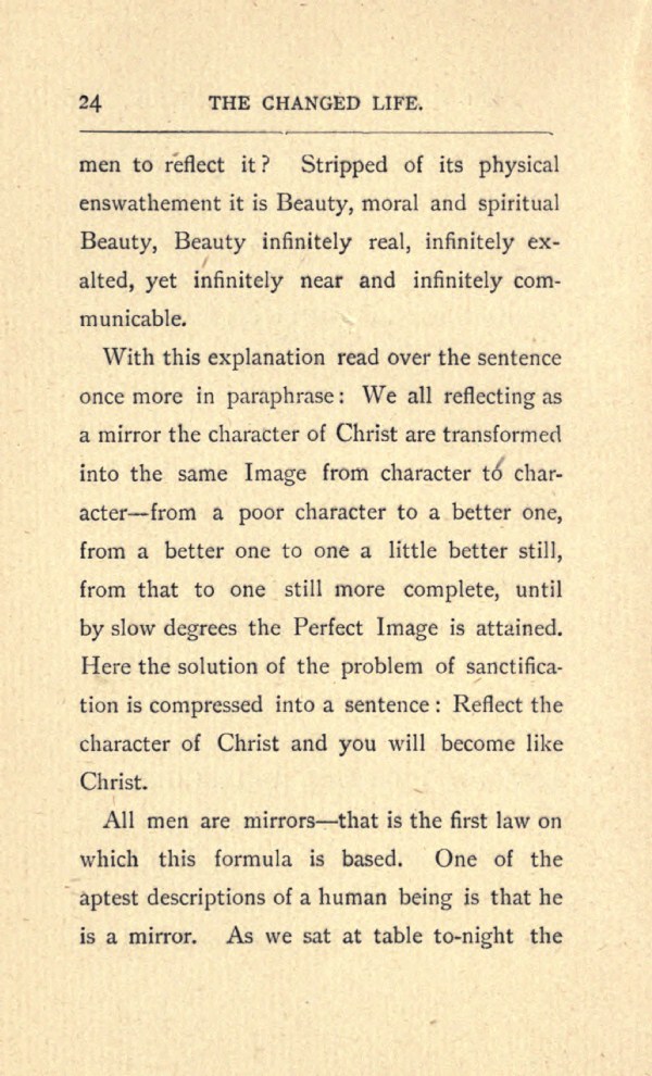 With this explanation read over the sentence once more in paraphrase: We all reflecting as a mirror the character of Christ are transformed into the same Image from character to character --- from a poor character to a better one, from a better one to one a little better still, from that to one still more complete, until by slow degrees the Perfect Image is attained. Here the solution of the problem of sanctification is compressed into a sentence: Reflect the character of Christ and you will become like Christ.