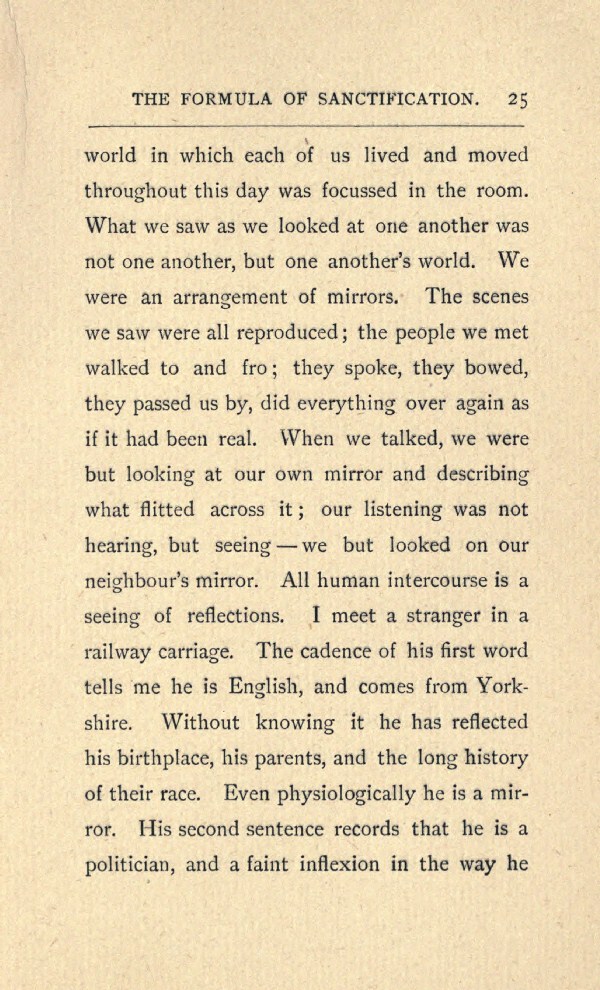 world in which each of us lived and moved throughout this day was focussed in the room. What we saw as we looked at one another was not one another, but one another's world. We were an arrangement of mirrors. The scenes we saw were all reproduced; the people we met walked to and fro; they spoke, they bowed, they passed us by, did everything over again as if it had been real. When we talked, we were but looking at our own mirror and describing what flitted across it; our listening was not hearing, but seeing --- we but looked on our neighbour's mirror. All human intercourse is a seeing of reflections. I meet a stranger in a railway carriage. The cadence of his first word tells me he is English, and comes from Yorkshire. Without knowing it he has reflected his birthplace, his parents, and the long history of their race. Even physiologically he is a mirror. His second sentence records that he is a politician, and a faint inflexion in the way he