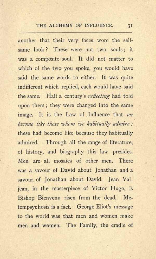 another that their very faces wore the self-same look? These were not two souls; it was a composite soul. It did not matter to which of the two you spoke, you would have said the same words to either. It was quite indifferent which replied, each would have said the same. Half a century's reflecting had told upon them; they were changed into the same image. It is the Law of Influence that we become like those whom we habitually admire: these had become like because they habitually admired. Through all the range of literature, of history, and biography this law presides. Men are all mosaics of other men. There was a savour of David about Jonathan and a savour of Jonathan about David. Jean Valjean, in the masterpiece of Victor Hugo, is Bishop Bienvenu risen from the dead. Metempsychosis is a fact. George Eliot's message to the world was that men and women make men and women. The Family, the cradle of