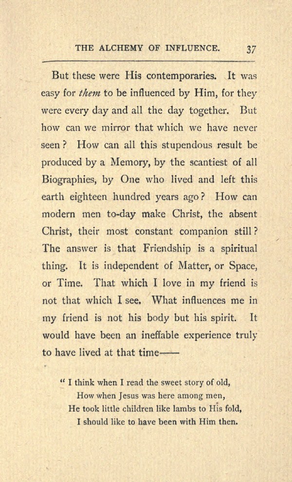 But these were His contemporaries. It was easy for them to be influenced by Him, for they were every day and all the day together. But how can we mirror that which we have never seen? How can all this stupendous result be produced by a Memory, by the scantiest of all Biographies, by One who lived and left this earth eighteen hundred years ago? How can modern men to-day make Christ, the absent Christ, their most constant companion still? The answer is that Friendship is a spiritual thing. It is independent of Matter, or Space, or Time. That which I love in my friend is not that which I see. What influences me in my friend is not his body but his spirit. It would have been an ineffable experience truly to have lived at that time ----