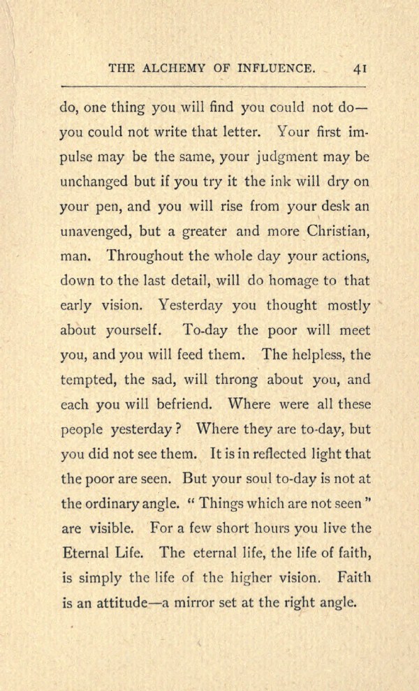 do, one thing you will find you could not do --- you could not write that letter. Your first impulse may be the same, your judgment may be unchanged but if you try it the ink will dry on your pen, and you will rise from your desk an unavenged, but a greater and more Christian, man. Throughout the whole day your actions, down to the last detail, will do homage to that early vision. Yesterday you thought mostly about yourself. To-day the poor will meet you, and you will feed them. The helpless, the tempted, the sad, will throng about you, and each you will befriend. Where were all these people yesterday? Where they are to-day, but you did not see them. It is in reflected light that the poor are seen. But your soul to-day is not at the ordinary angle. "Things which are not seen" are visible. For a few short hours you live the Eternal Life. The eternal life, the life of faith, is simply the life of the higher vision. Faith is an attitude --- a mirror set at the right angle.