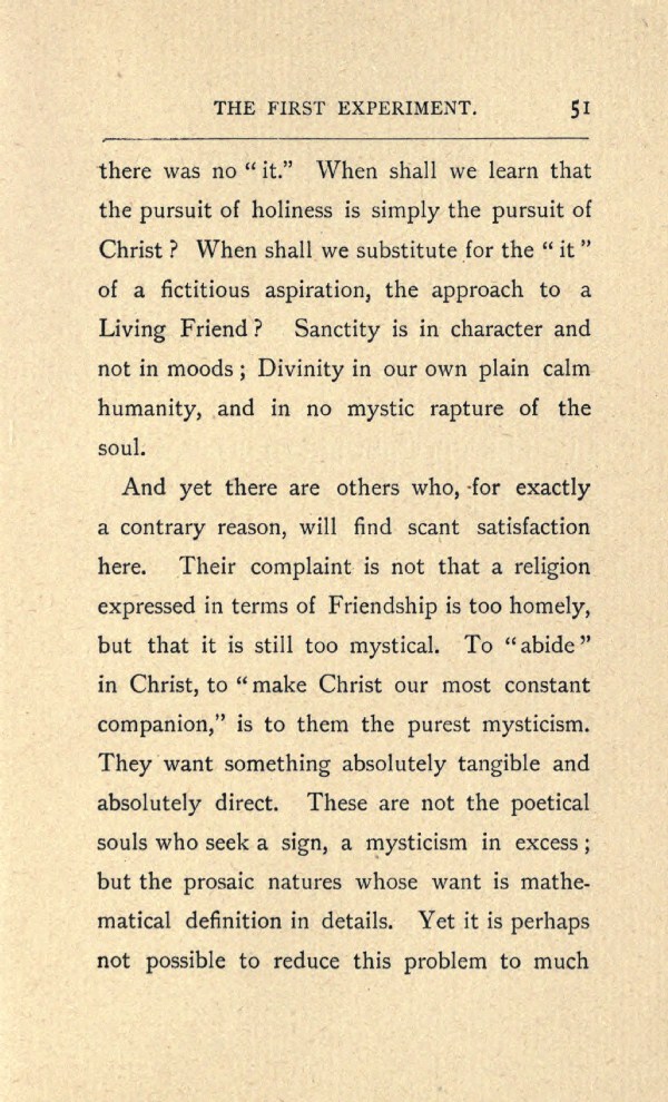 And yet there are others who, for exactly a contrary reason, will find scant satisfaction here. Their complaint is not that a religion expressed in terms of Friendship is too homely, but that it is still too mystical. To "abide" in Christ, to "make Christ our most constant companion," is to them the purest mysticism. They want something absolutely tangible and absolutely direct. These are not the poetical souls who seek a sign, a mysticism in excess; but the prosaic natures whose want is mathematical definition in details. Yet it is perhaps not possible to reduce this problem to much