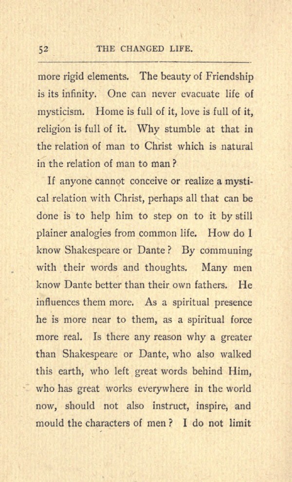 If anyone cannot conceive or realize a mystical relation with Christ, perhaps all that can be done is to help him to step on to it by still plainer analogies from common life. How do I know Shakespeare or Dante? By communing with their words and thoughts. Many men know Dante better than their own fathers. He influences them more. As a spiritual presence he is more near to them, as a spiritual force more real. Is there any reason why a greater than Shakespeare or Dante, who also walked this earth, who left great words behind Him, who has great works everywhere in the world now, should not also instruct, inspire, and mould the characters of men? I do not limit