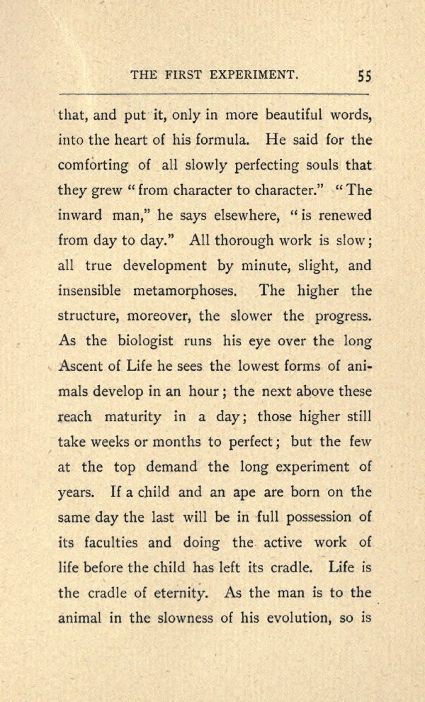 that, and put it, only in more beautiful words, into the heart of his formula. He said for the comforting of all slowly perfecting souls that they grew "from character to character." "The inward man," he says elsewhere, "is renewed from day to day." All thorough work is slow; all true development by minute, slight, and insensible metamorphoses. The higher the structure, moreover, the slower the progress. As the biologist runs his eye over the long Ascent of Life he sees the lowest forms of animals develop in an hour; the next above these reach maturity in a day; those higher still take weeks or months to perfect; but the few at the top demand the long experiment of years. If a child and an ape are born on the same day the last will be in full possession of its faculties and doing the active work of life before the child has left its cradle. Life is the cradle of eternity. As the man is to the animal in the slowness of his evolution, so is