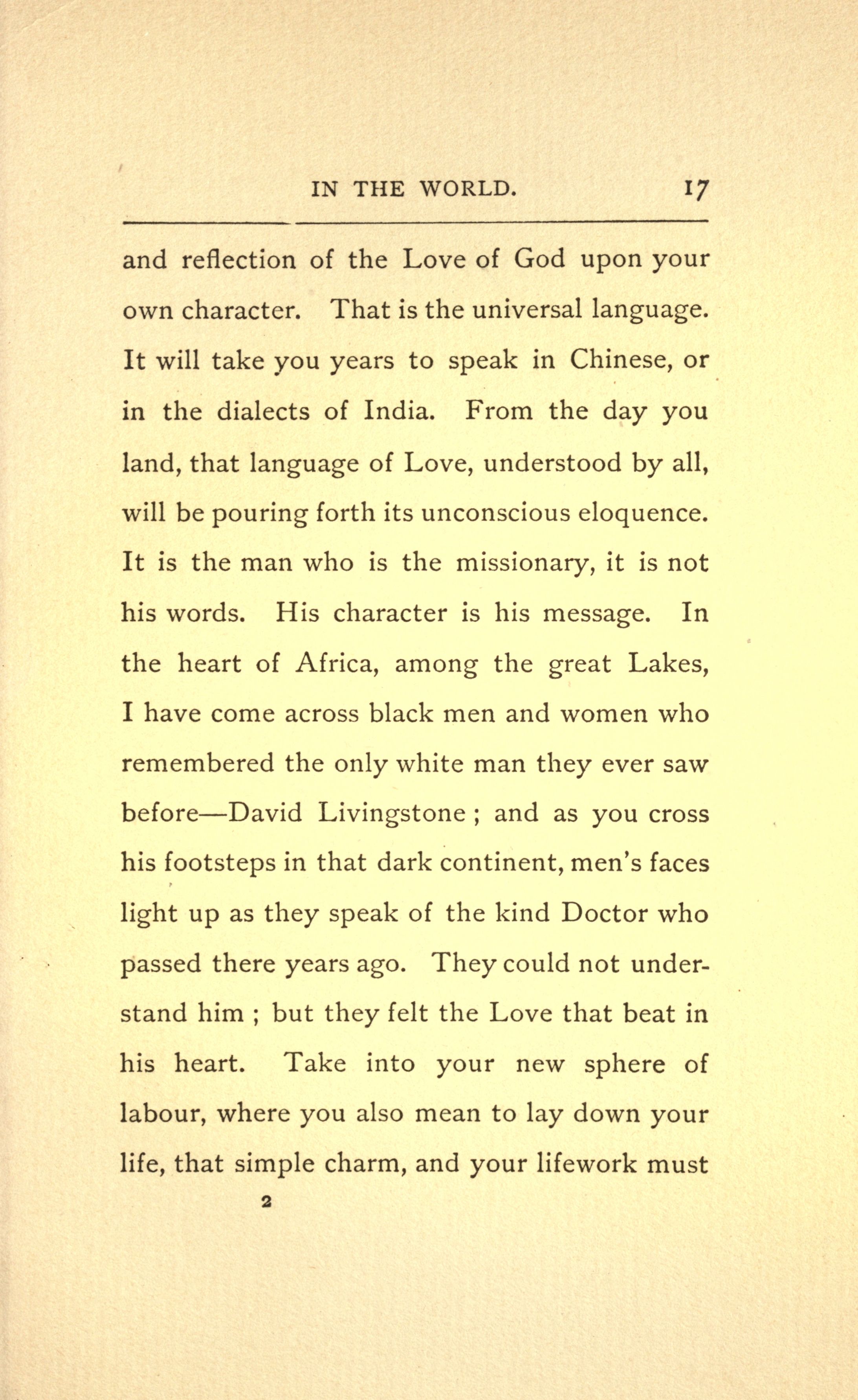 and reflection of the Love of God upon your own character. That is the universal language. It will take you years to speak in Chinese, or in the dialects of India. From the day you land, that language of Love, understood by all, will be pouring forth its unconscious eloquence. It is the man who is the missionary, it is not his words. His character is his message. In the heart of Africa, among the great Lakes, I have come across black men and women who remembered the only white man they ever saw before---David Livingstone and as you cross his footsteps in that dark continent, men's faces light up as they speak of the kind Doctor who passed there years ago. They could not understand him but they felt the Love that beat in his heart. Take into your new sphere of labour, where you also mean to lay down your life, that simple charm, and your lifework must